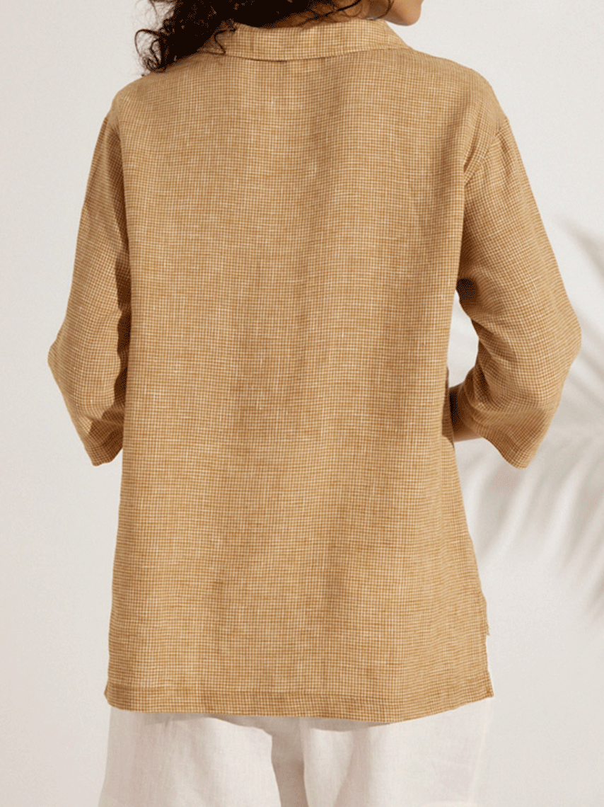 Women's Casual Checked Linen Classic Doll Collar Shirt