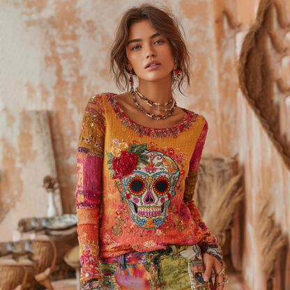 Women's Classic Mexican Sugar Skeleton Catrina Day Of The Dead Inspired Painting Embroidered Casual Linen Long Sleeve T-shirt