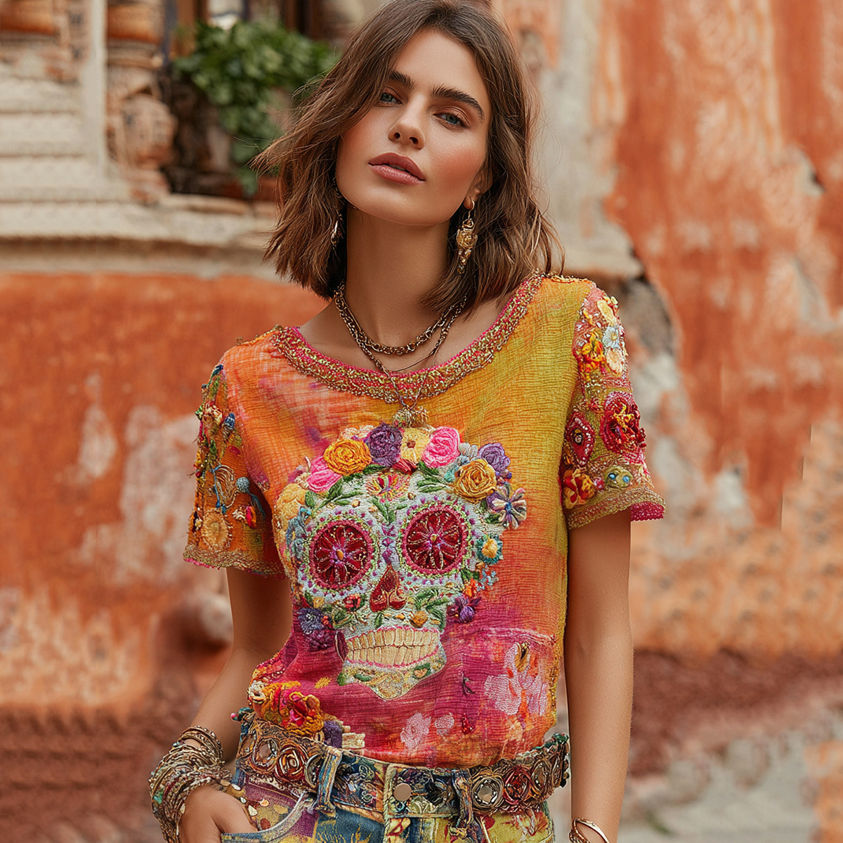 Women's Classic Mexican Sugar Skeleton Catrina Day Of The Dead Inspired Painting Embroidered Casual Linen T-shirt