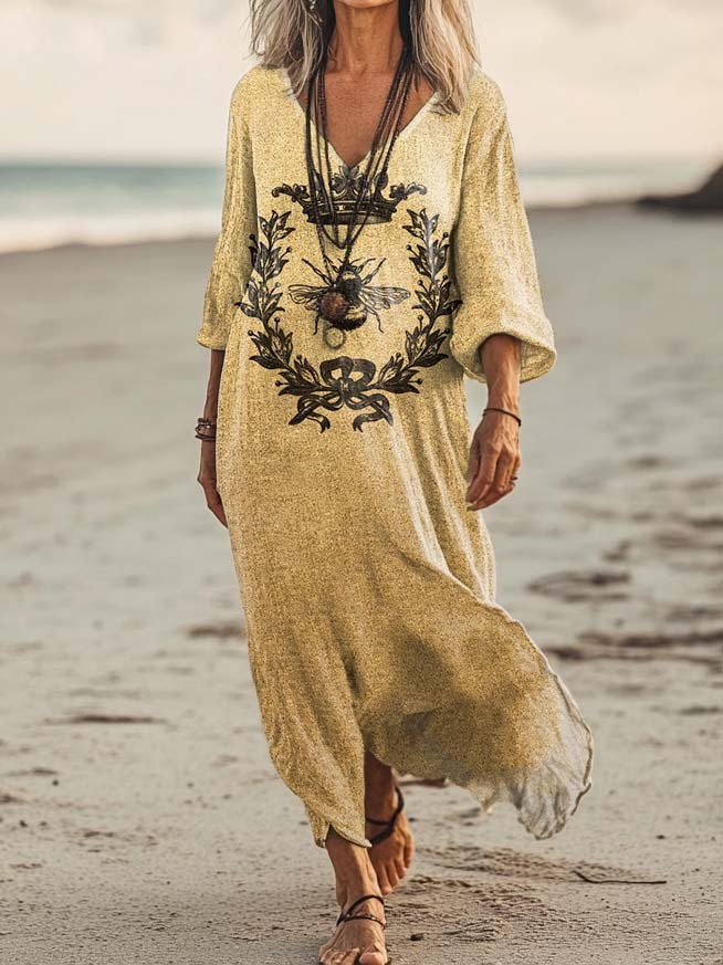 Women's Crown Bee Floral Art Print Pocket Cotton Dress