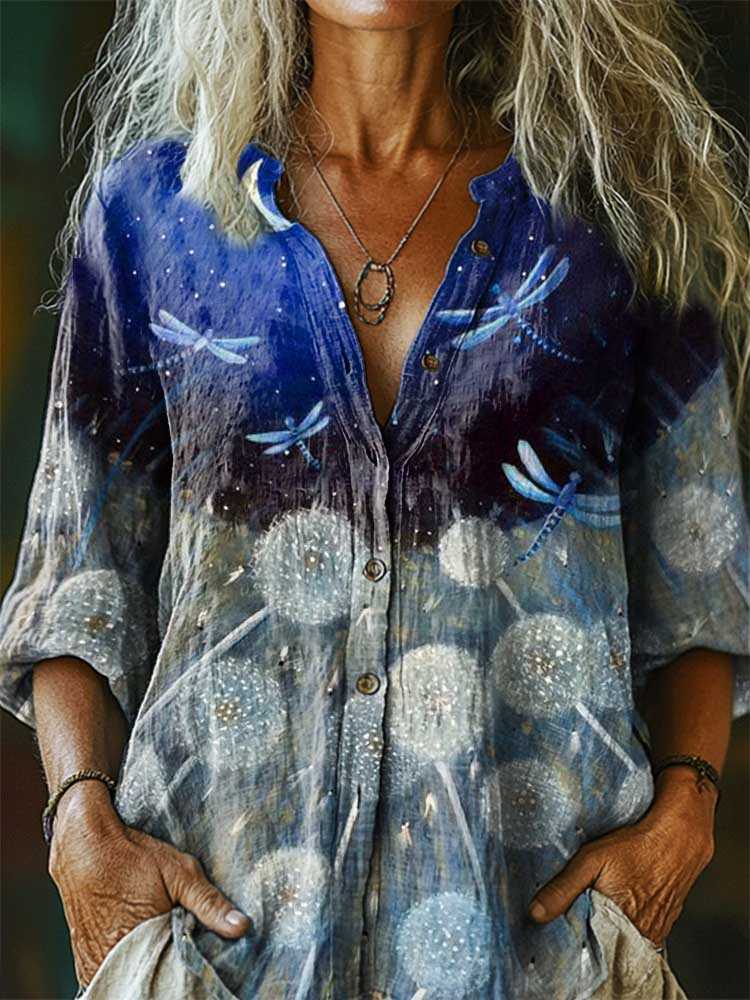 Women's Dandelion Dragonfly Pattern Art Print Cotton Linen Casual Shirt