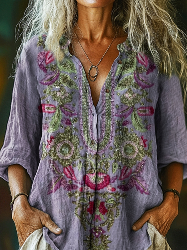 Women's Ethnic Floral Art Pattern Print Casual Cotton Linen Shirt