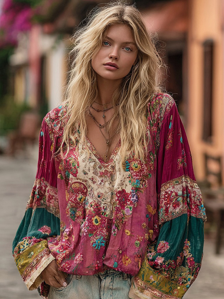 Women's Floral Embroidery Boho Colorblock Art Linen Blend V-neck Shirt