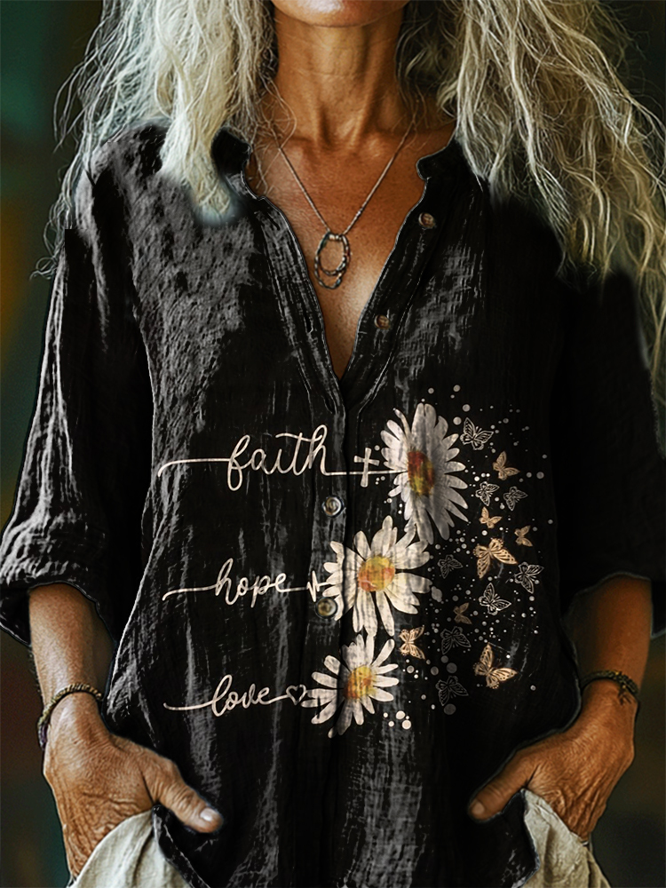 Women's Hippie Floral Art Print Casual Cotton Linen Shirt