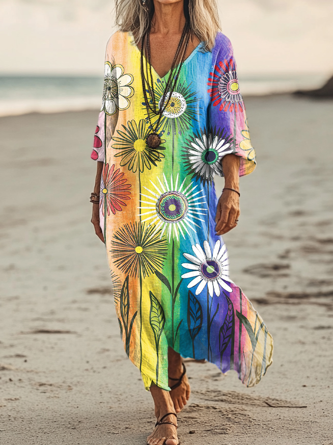 Women's Hippie Floral Art Print Pocket Cotton Dress