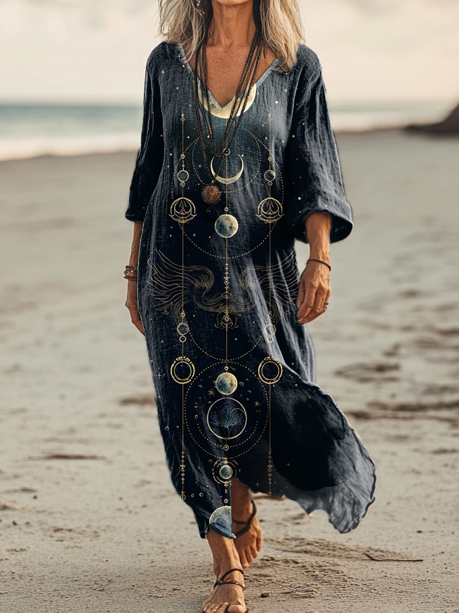 Women's Moon Art Print Pocket Cotton Dress
