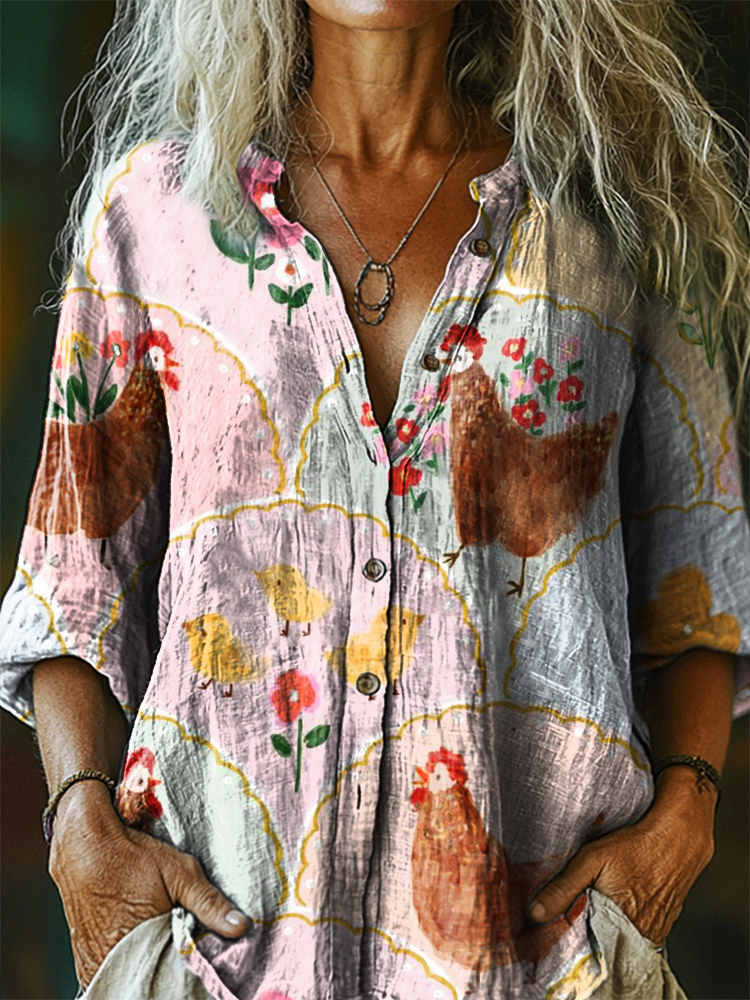 Women's Retro Cute Chicken Art Print Casual Cotton Linen Shirt