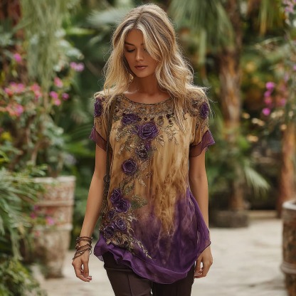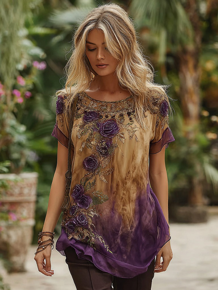 Women's Retro Purple Rose Gradient Casual Crew Neck T-shirt
