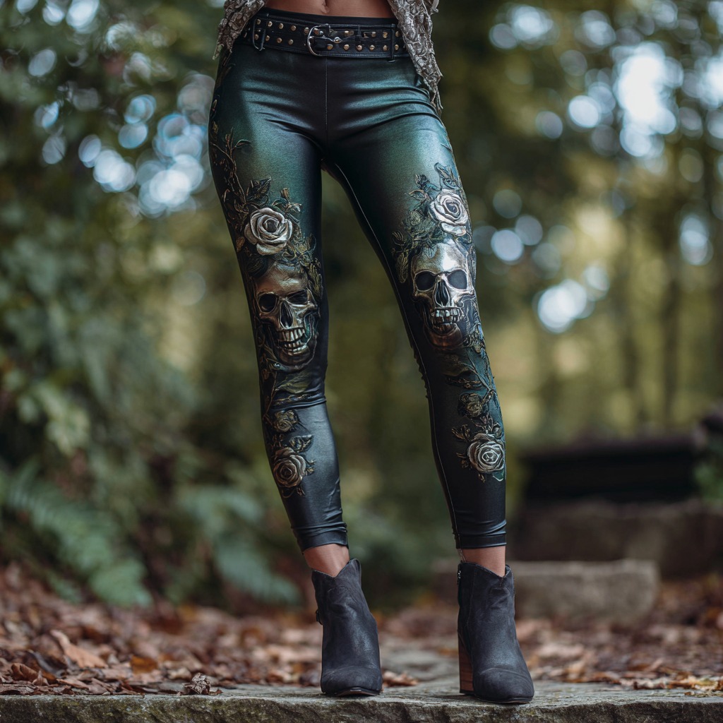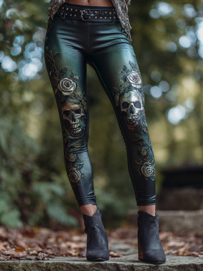 Women's Retro Skull Rose Pattern Leather Casual Leggings