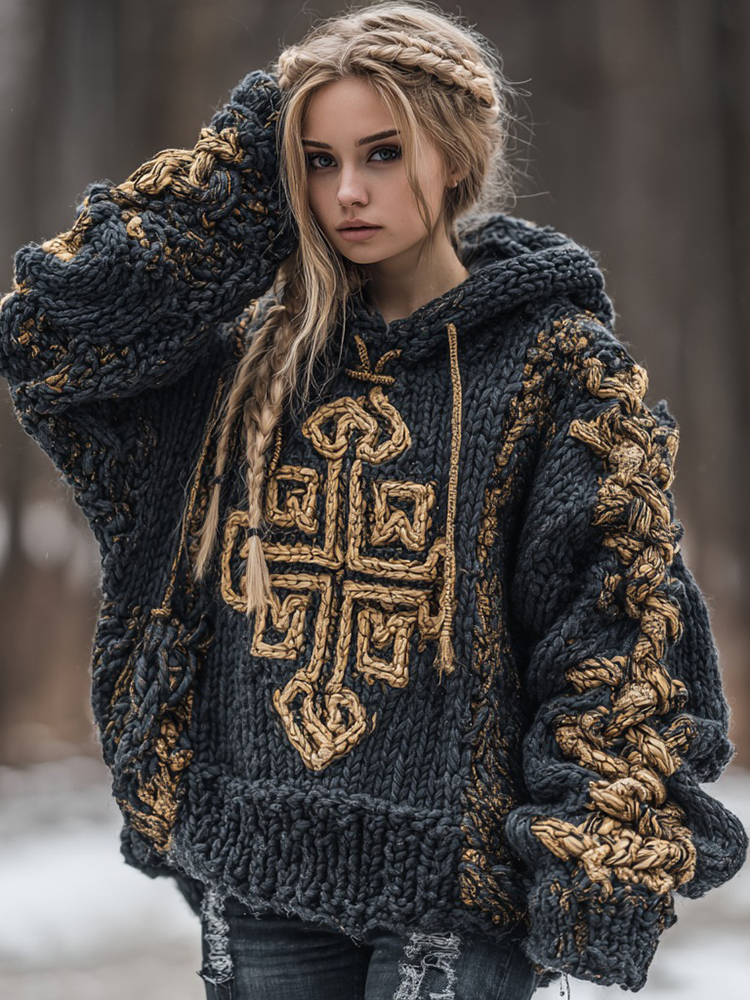 Women's Viking Celtic Knot Rune Knit Jacquard Comfortable Warm Hooded Sweater