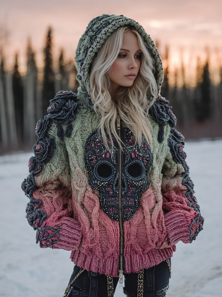 Women's Vintage Celtic Skull Gradient Art Cozy Knitted Hooded Cardigan