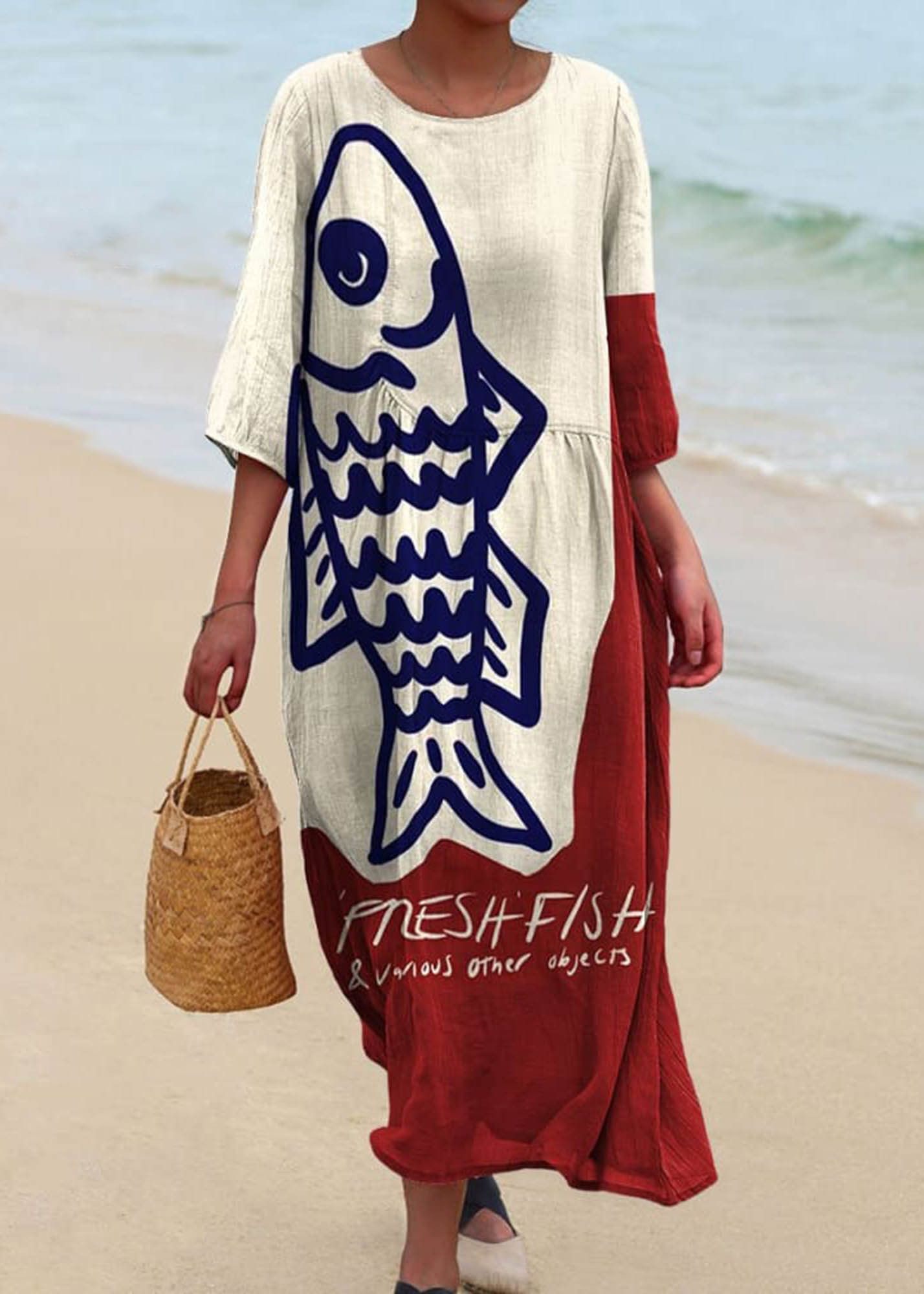 Women's Vintage Fish Art Print Pocket Cotton Dress