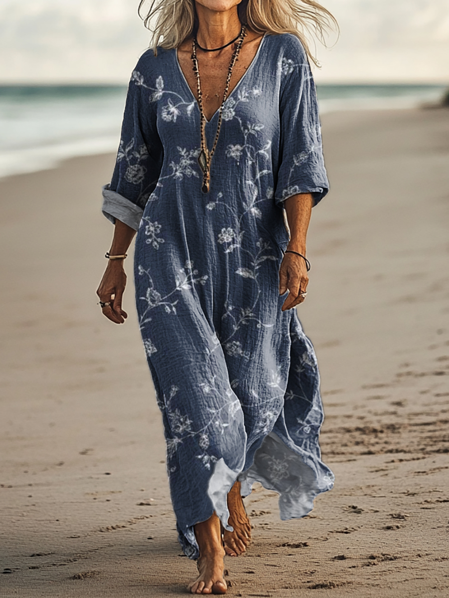 Women's Vintage Floral Art Print Pocket Cotton Dress