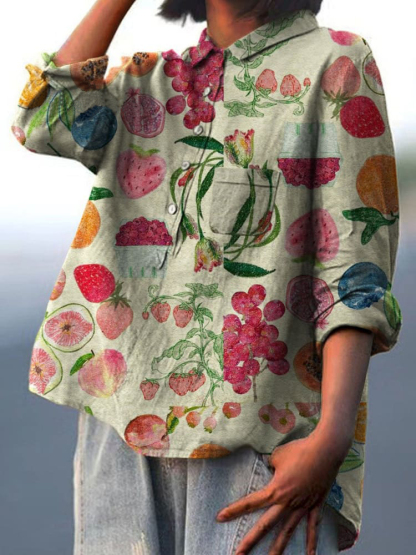 Women's Vintage Fruit Art Print Casual Cotton And Linen Shirt
