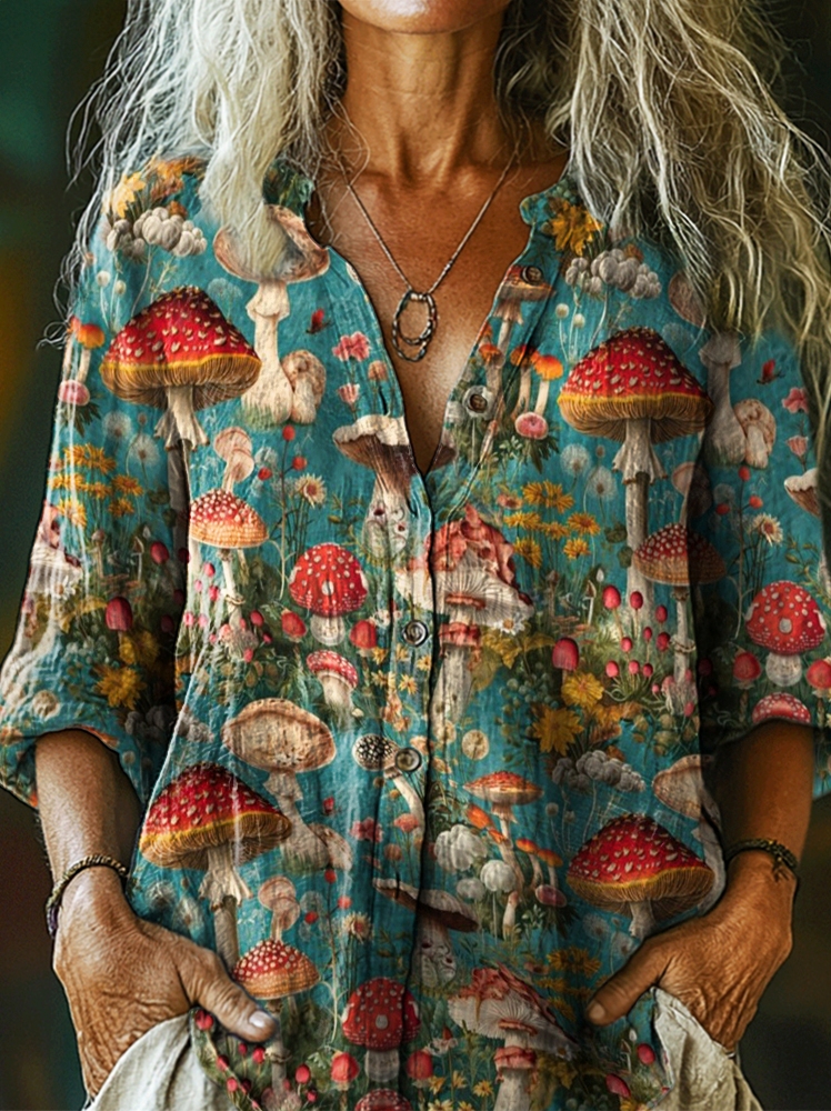 Women's Vintage Mushroom Garden Art Pattern Print Casual Cotton Linen Shirt