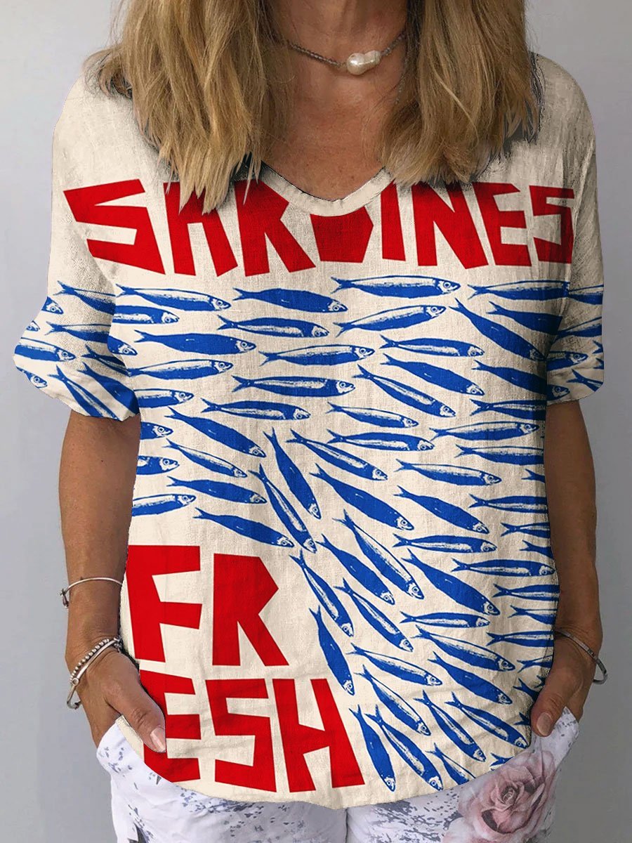Women's Vintage Ocean Fish Sardines Art Print Casual Cotton And Linen Shirt
