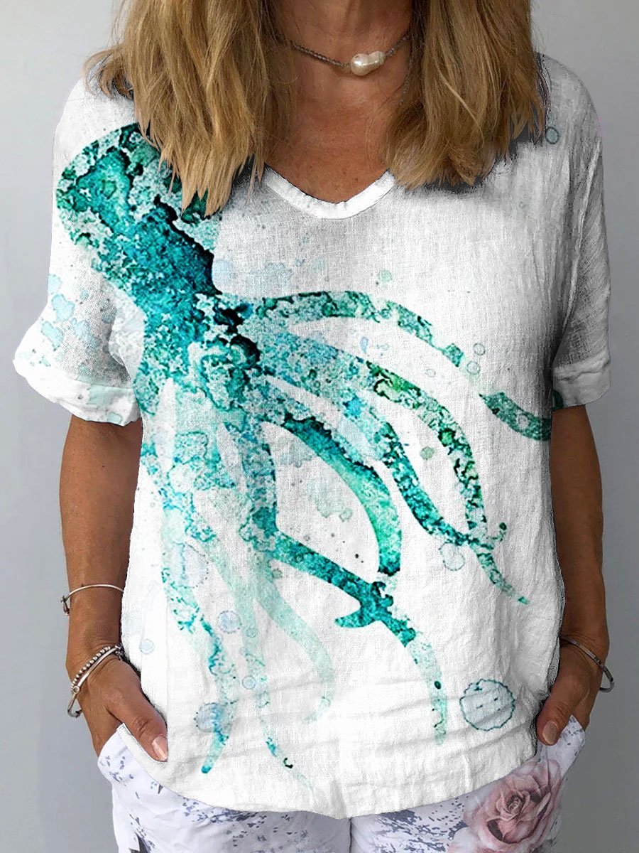 Women's Vintage Ocean Octopus Art Print Casual Cotton And Linen Shirt