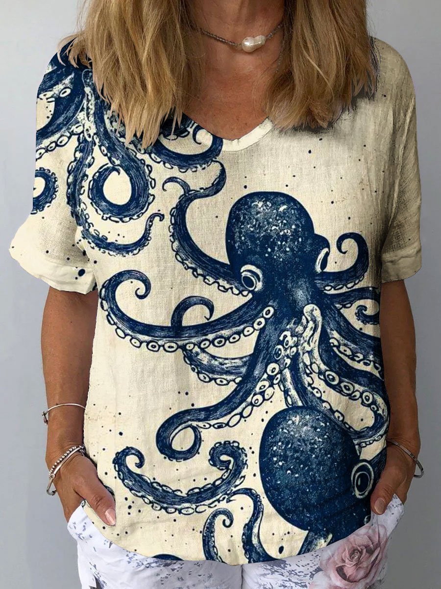Women's Vintage Ocean Octopus Art Print Casual Cotton And Linen Shirt