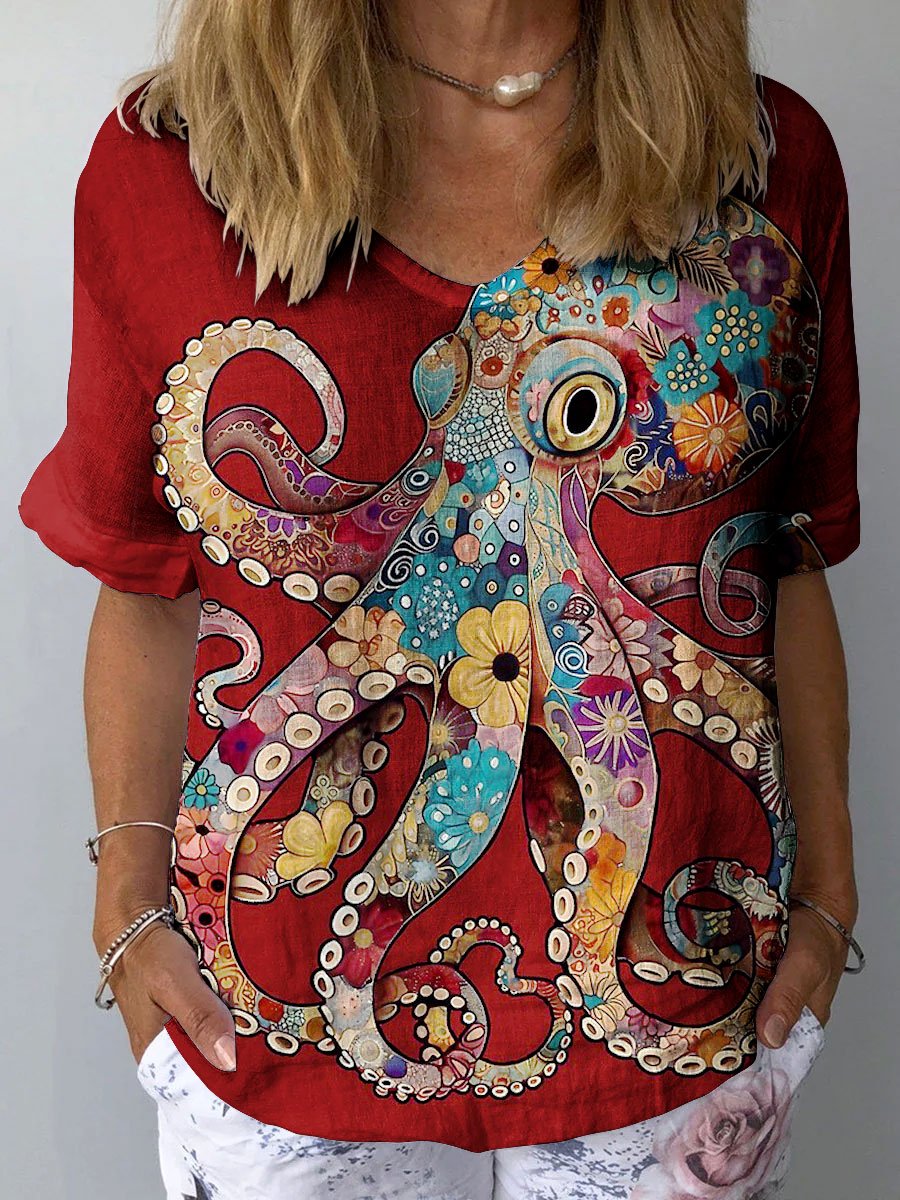 Women's Vintage Ocean Octopus Art Print Casual Cotton And Linen Shirt