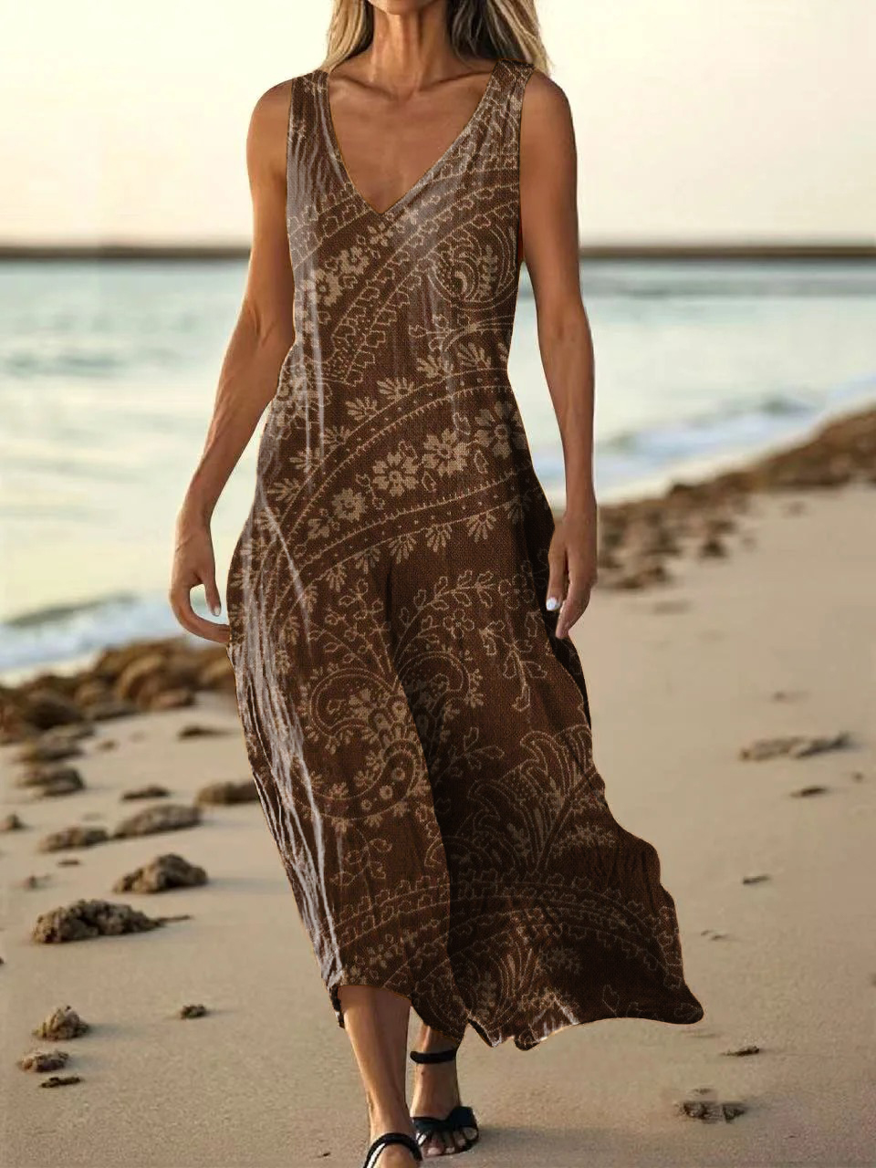 Women's Vintage Perlis Floral Art Print Pocket Cotton Dress