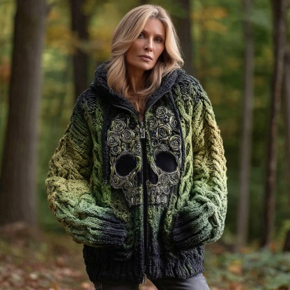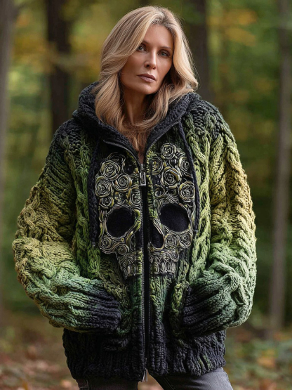 Women's Vintage Skull Rose Chunky Knit Warm Zip-up Hooded Sweater