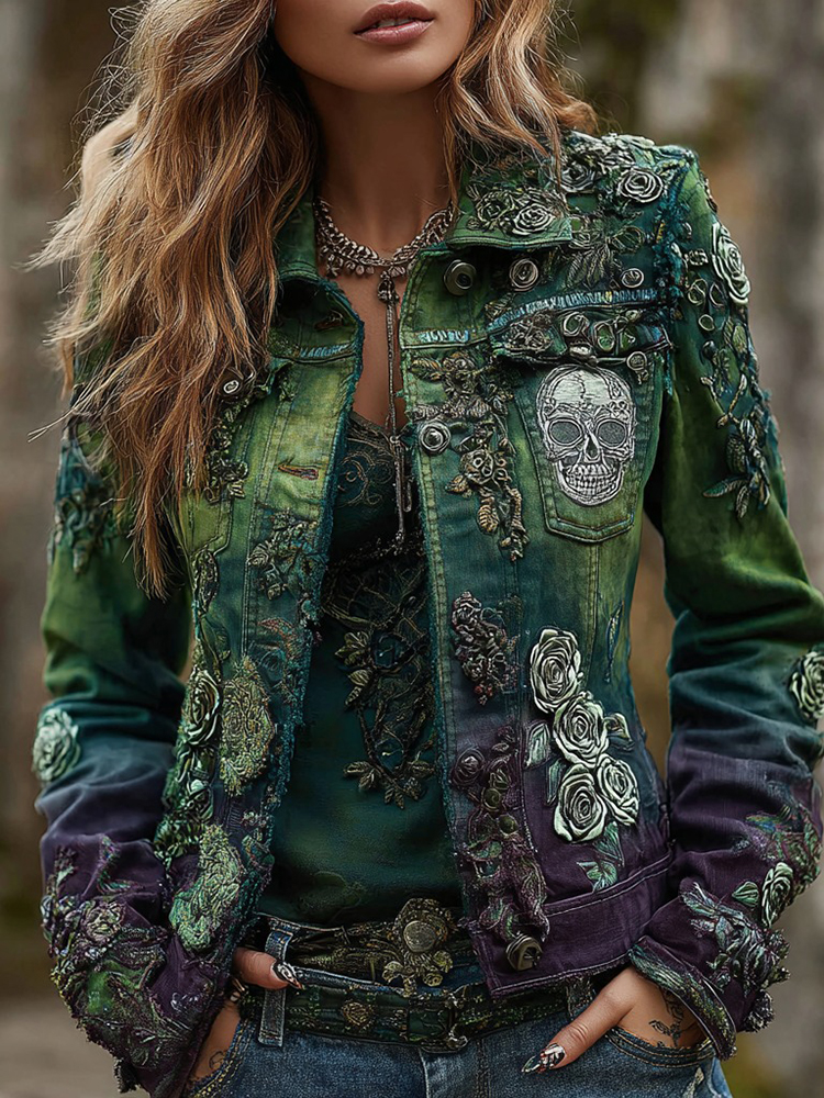 Women's Vintage Skull Rose Embroidered Gradient Denim Jacket
