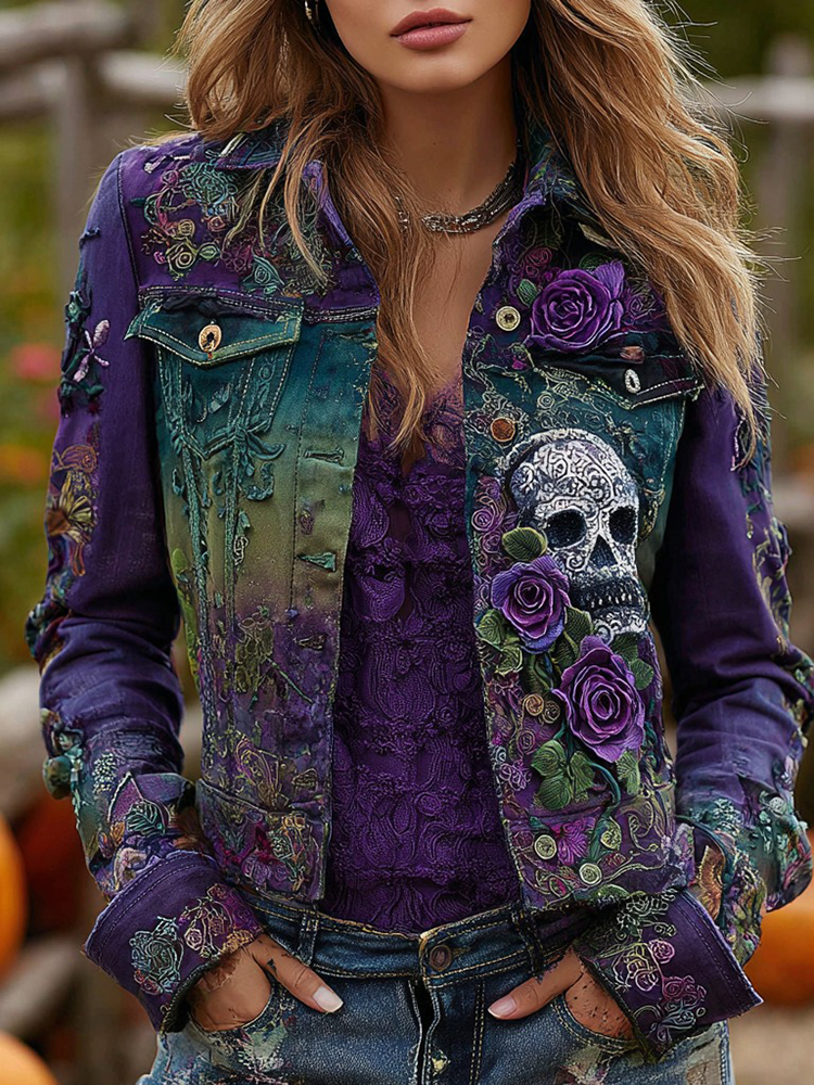 Women's Vintage Skull Rose Embroidered Gradient Denim Jacket