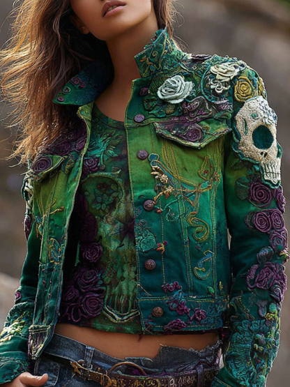 Women's Vintage Skull Rose Embroidered Gradient Denim Jacket