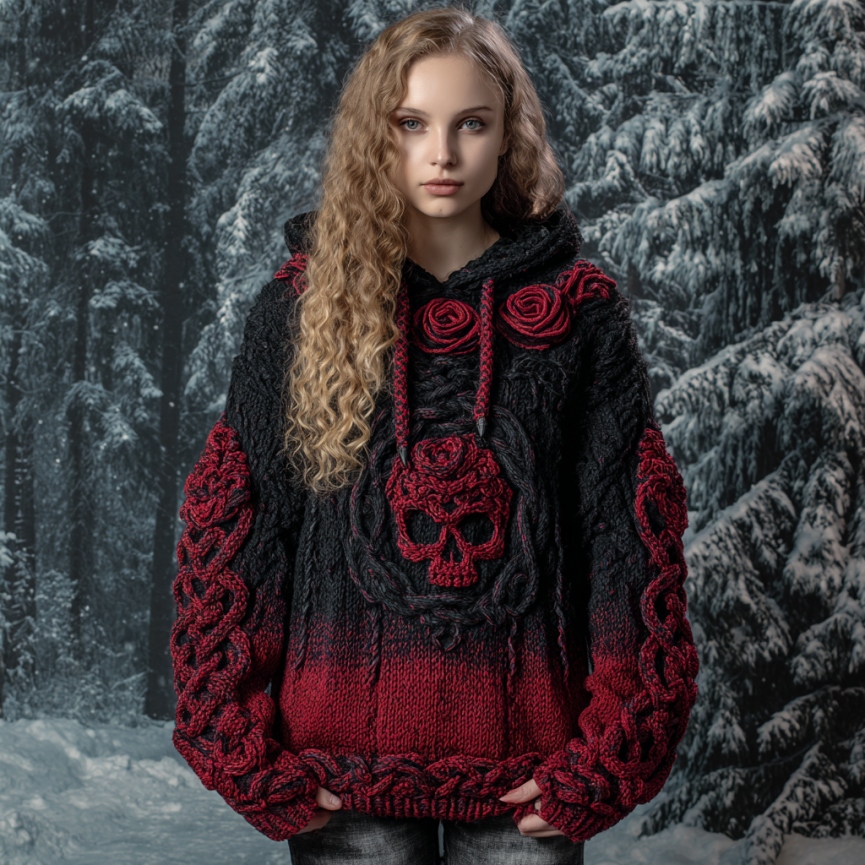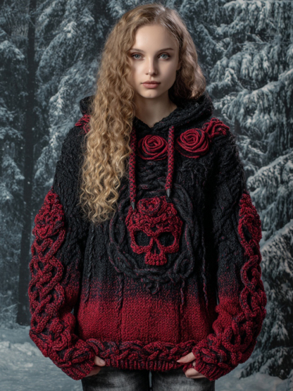 Women's Vintage Viking Tribal Celtic Skull Gradient Art Chunky Knit Hooded Sweater