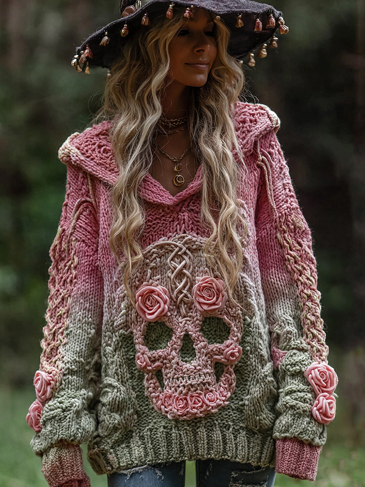 Women's Vintage Viking Tribal Jacquard Celtic With Rose And Skull Inspired Chunky Knit Hooded Sweater