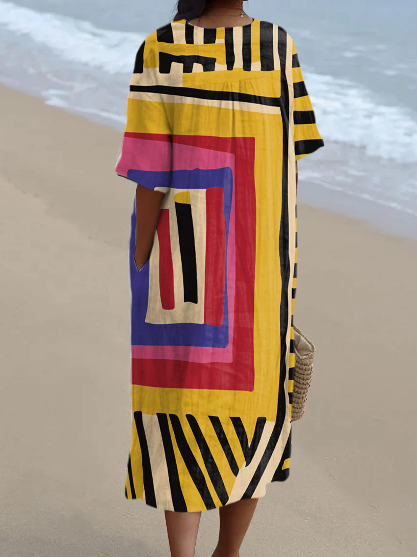 Women's Vintage Abstract Geometry Art Print Pocket Cotton Dress