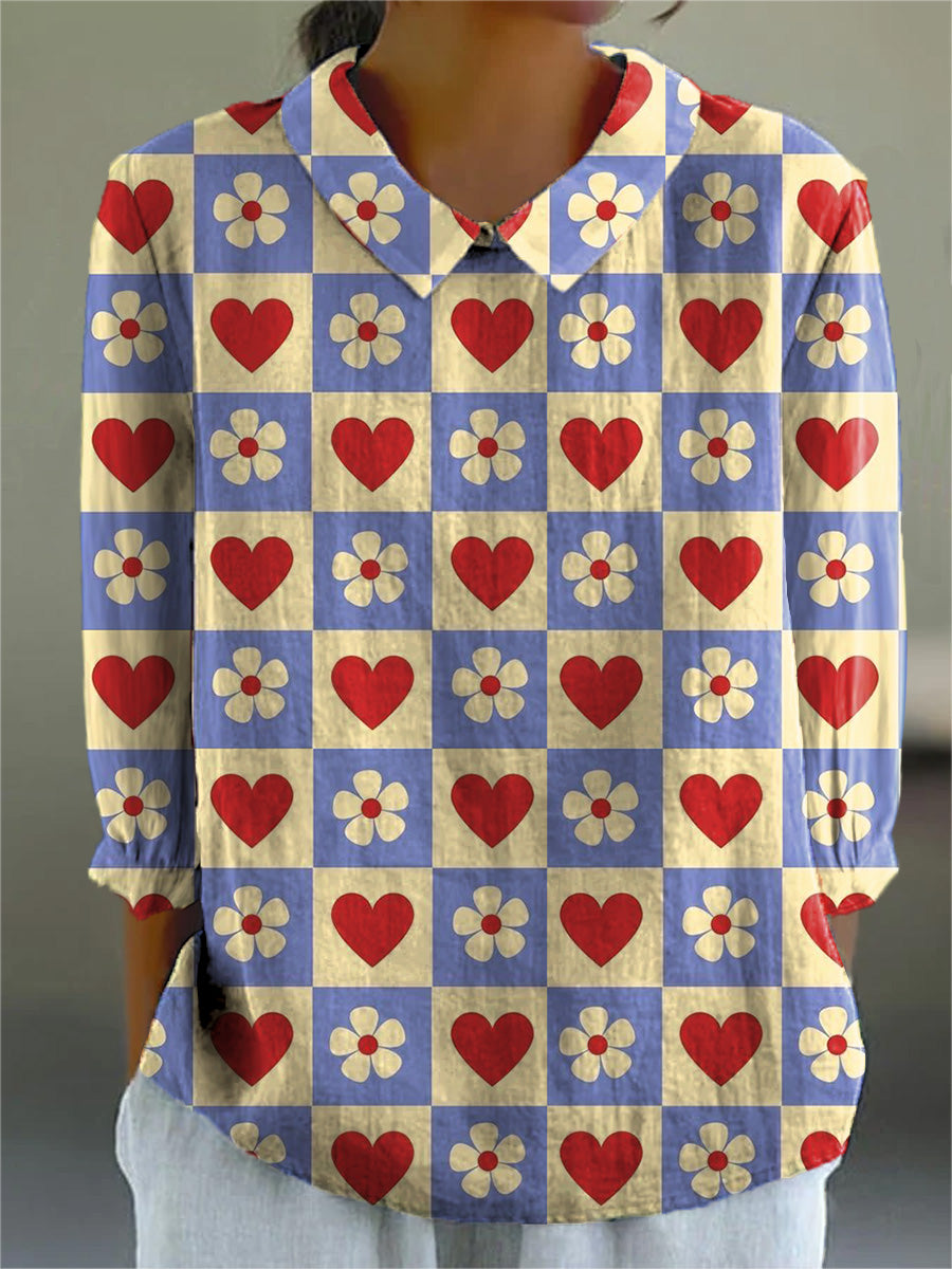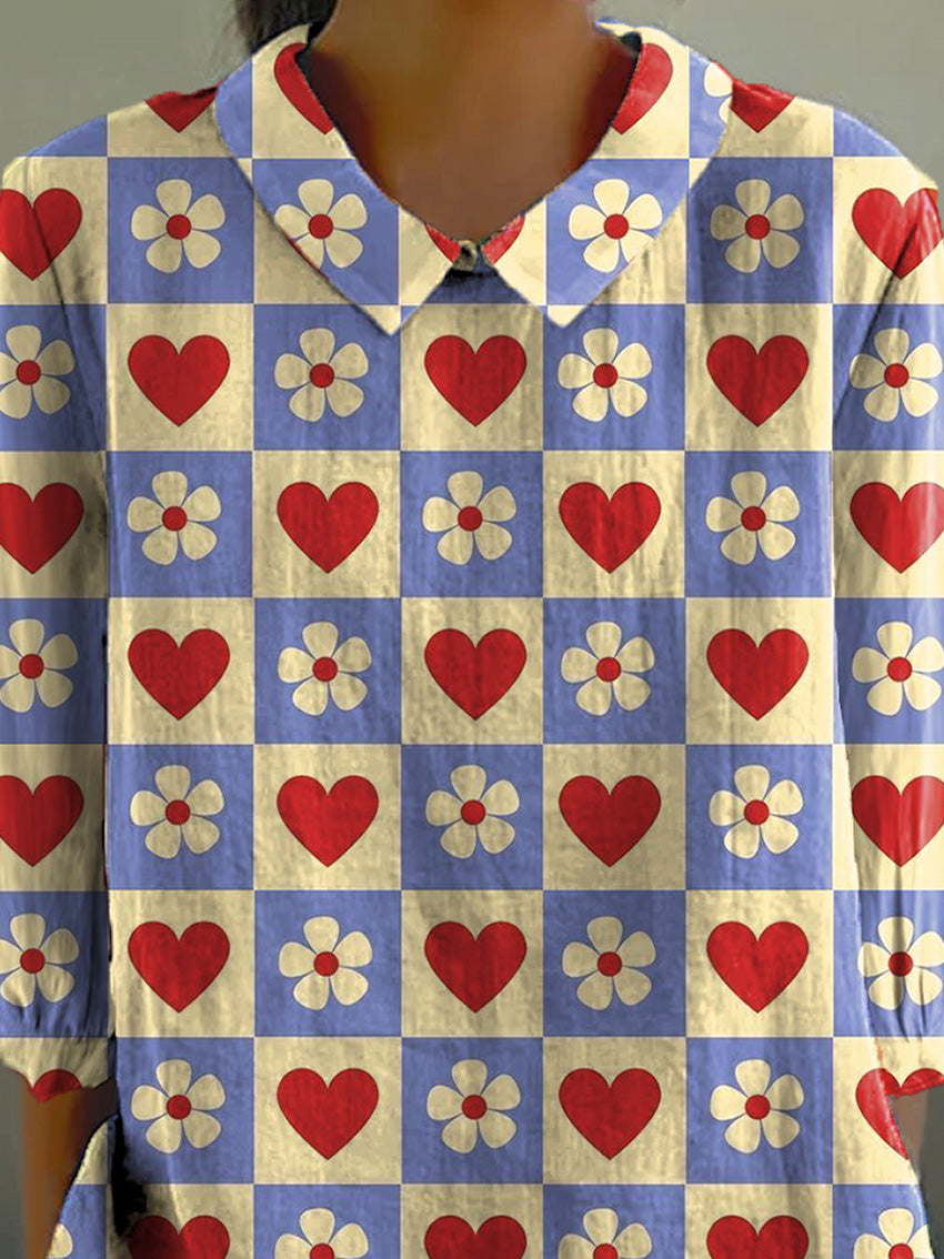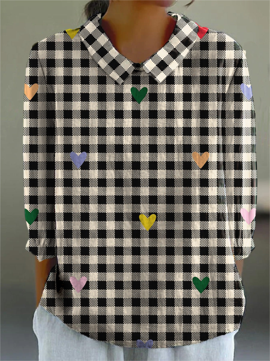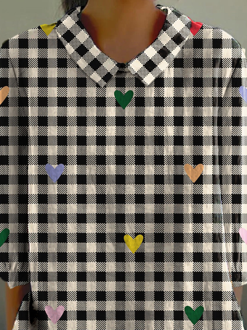 Retro Heart And Plaid Pattern Printed Women's Casual Cotton And Linen 3/4 Sleeve Shirt