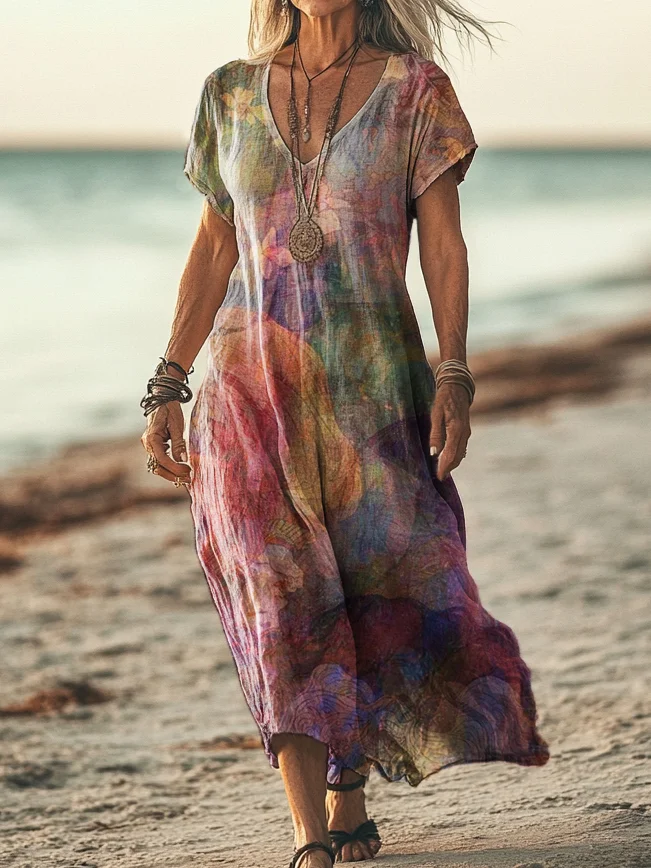 Abstract Painterly V-neck Resort Dress