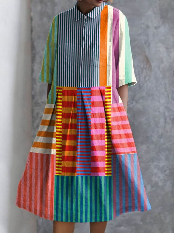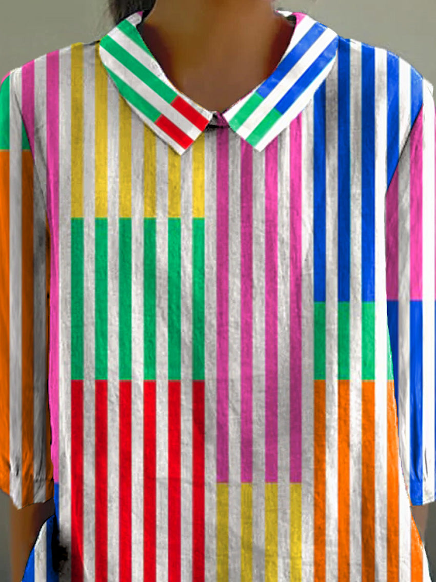 Colorful Geometric Strip Pattern Printed Women's Casual Cotton And Linen 3/4 Sleeve Shirt