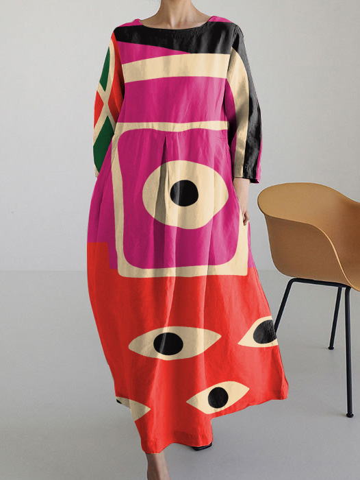 Women's Vintage Abstract Art Print Pocket Cotton Dress