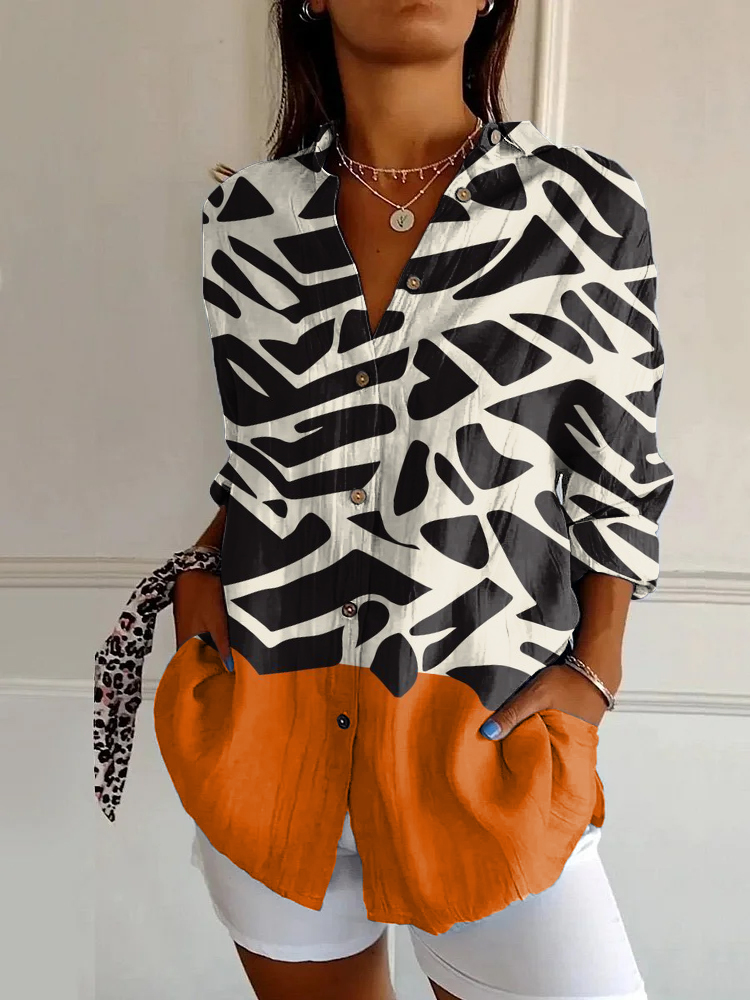 Women's Color-blocked Abstract Graphics Casual Cotton Linen Shirt
