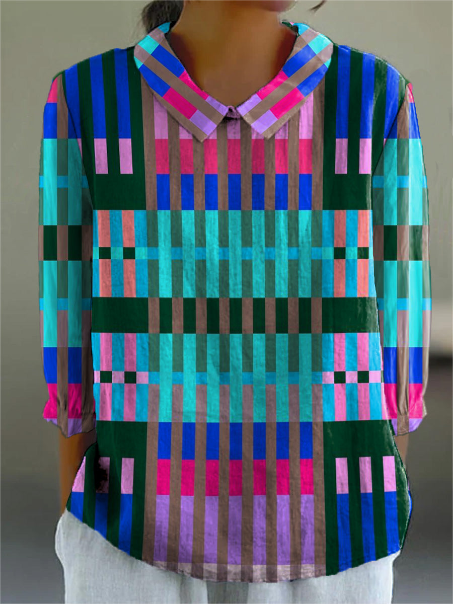 Women's Abstract Color-block Geometry Print Casual Cotton And Linen Shirt