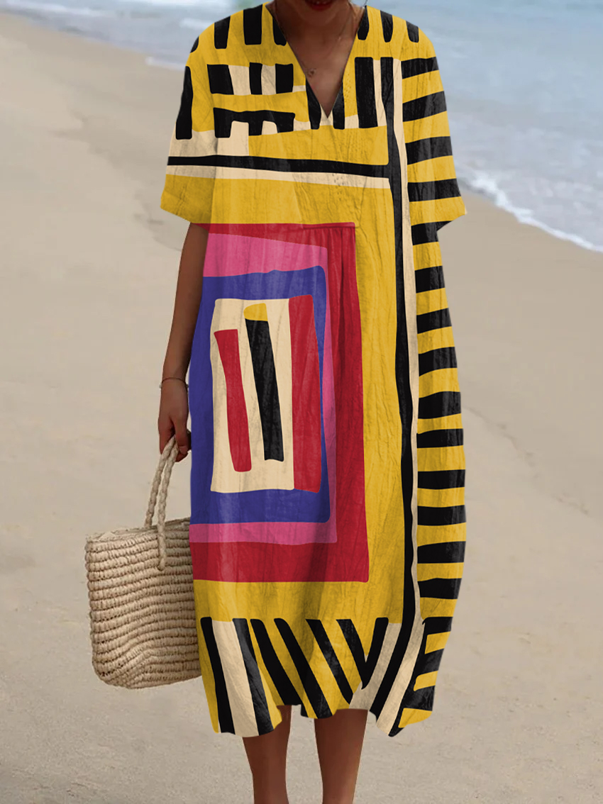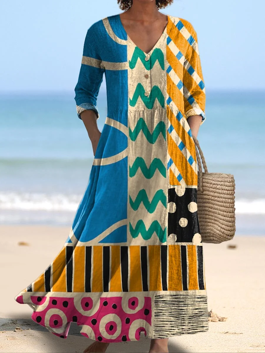 Women's Abstract Geometric Pattern Art Print V-Neck Button Pocket Cotton Dress