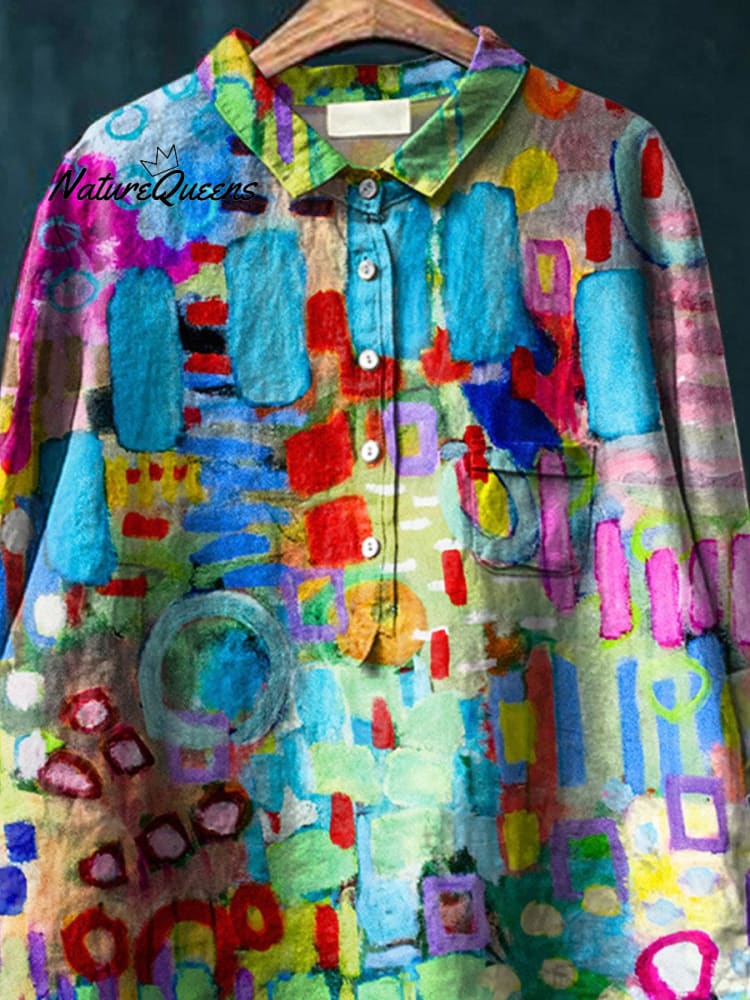 Colorful Abstract Painting Printed Women's Casual Cotton And Linen Shirt