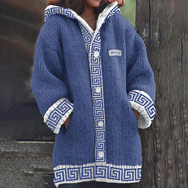 Greek Key Cozy Hooded Knit Sweater Cardigan