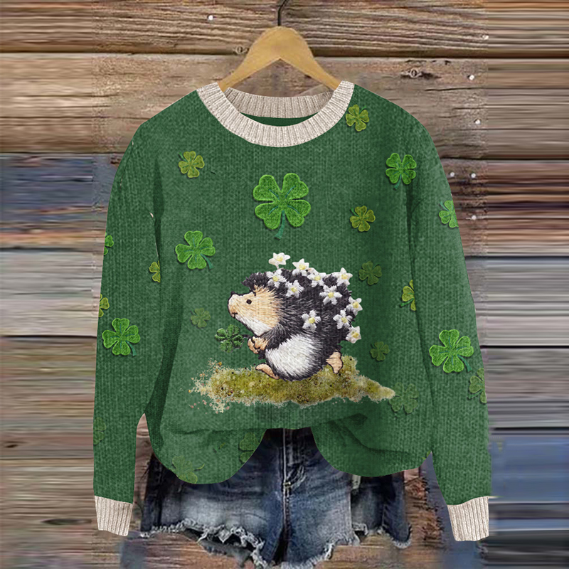 St. Patrick's Day 4 Leaf Clover Hedgehog Embroidery Art Cozy Knit Sweater