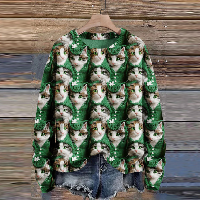 St. Patrick's Day Cat Art Print Knit Pullover Sweater