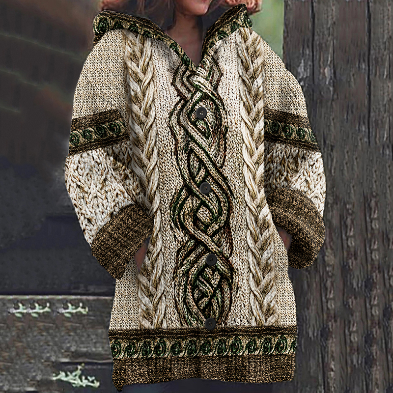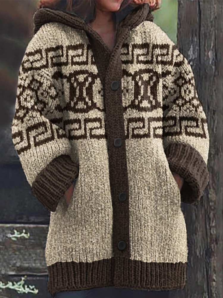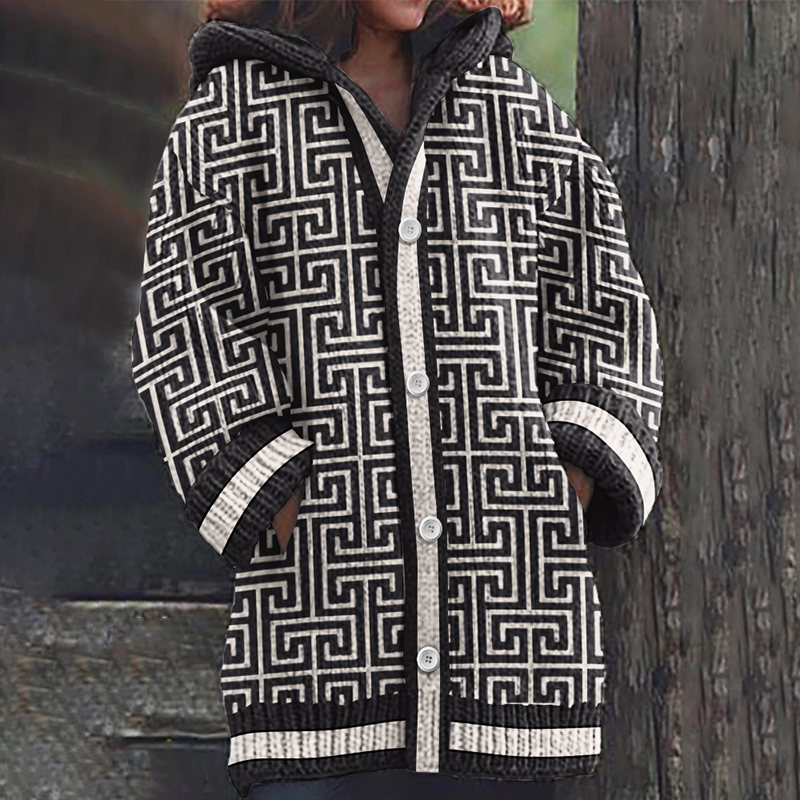 Greek Key Pattern Cozy Knit Hooded Cardigan
