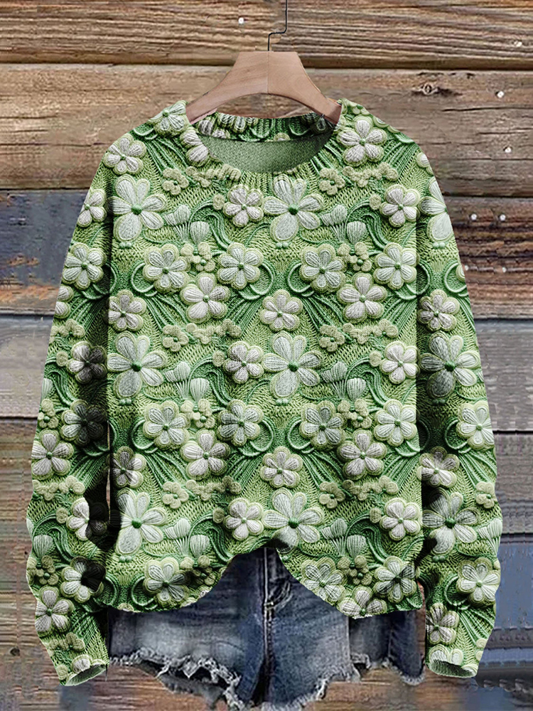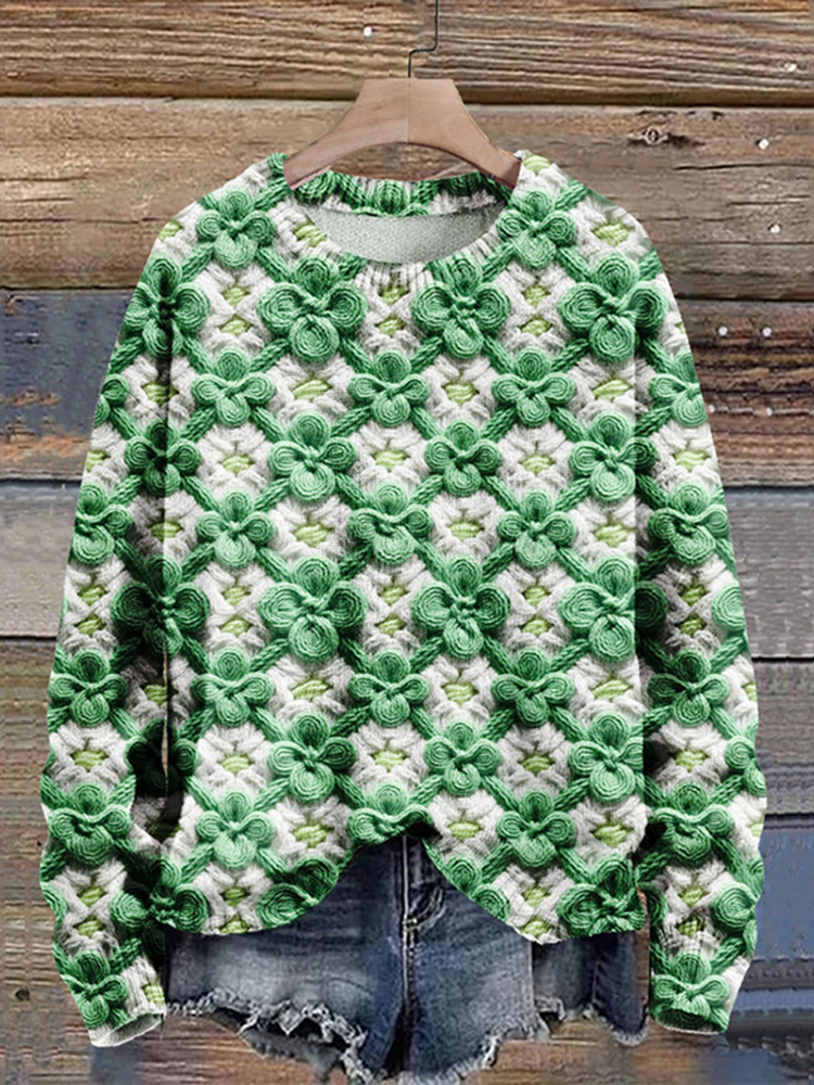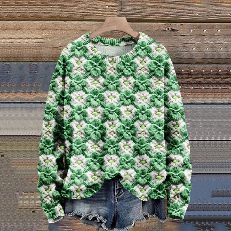 St. Patrick's Day 3 Leaf Clover Crochet Art Knitted Crew Neck Sweater