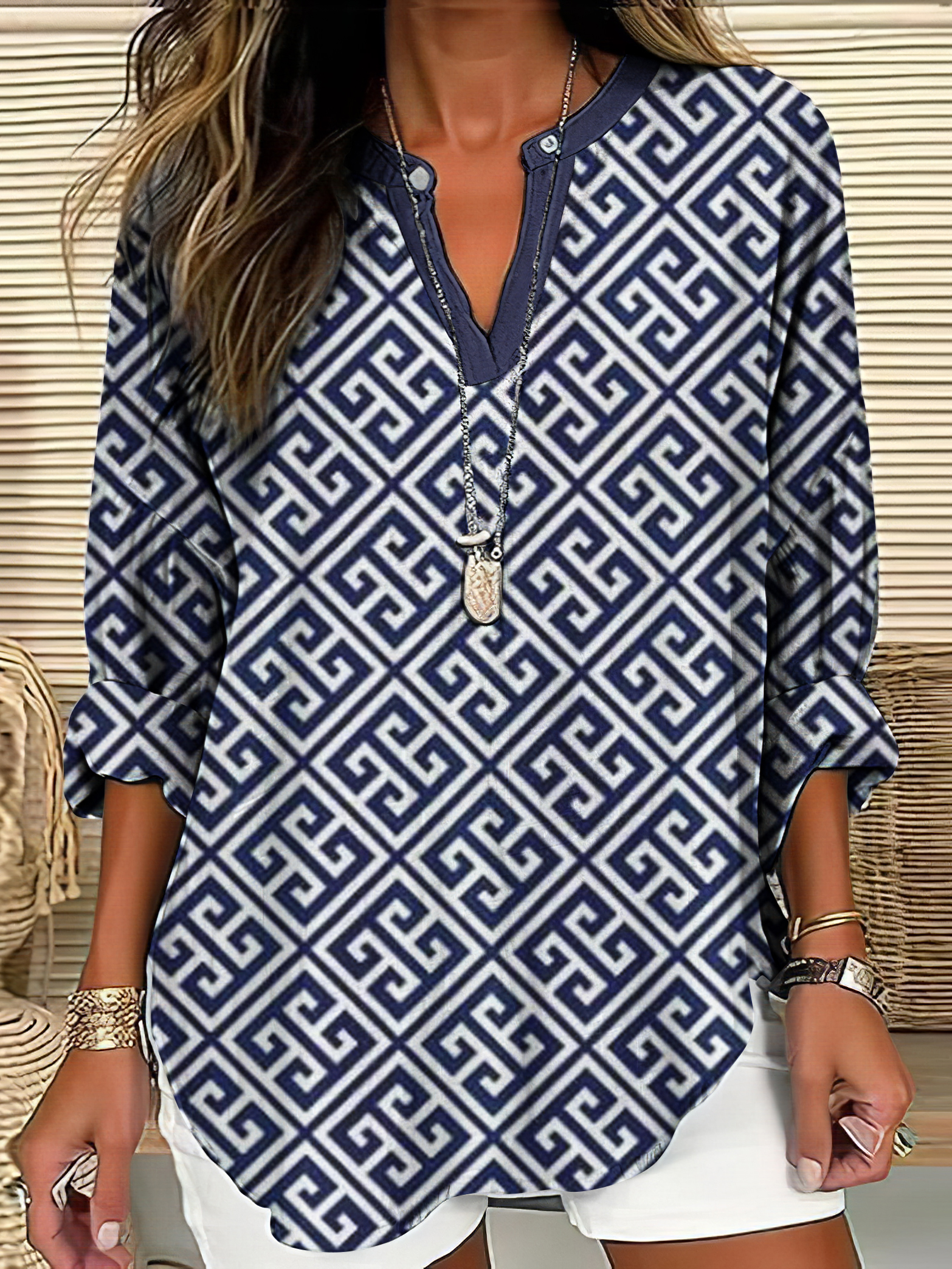 Women's Greek Geometric Art Linen Blend Cozy Tunic
