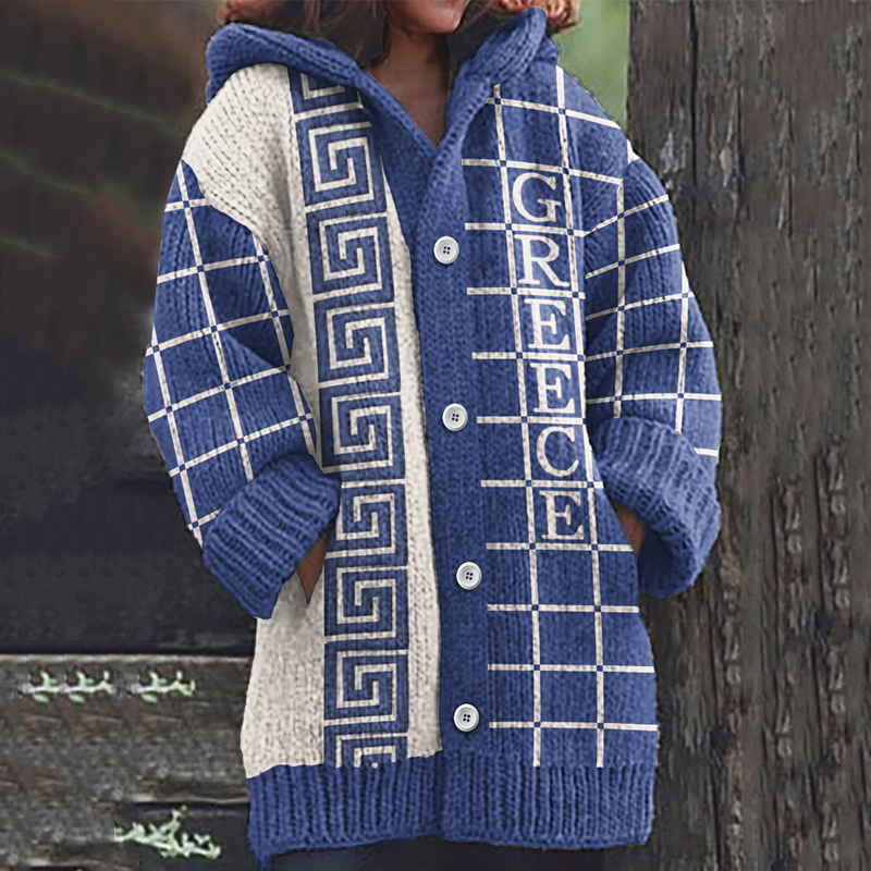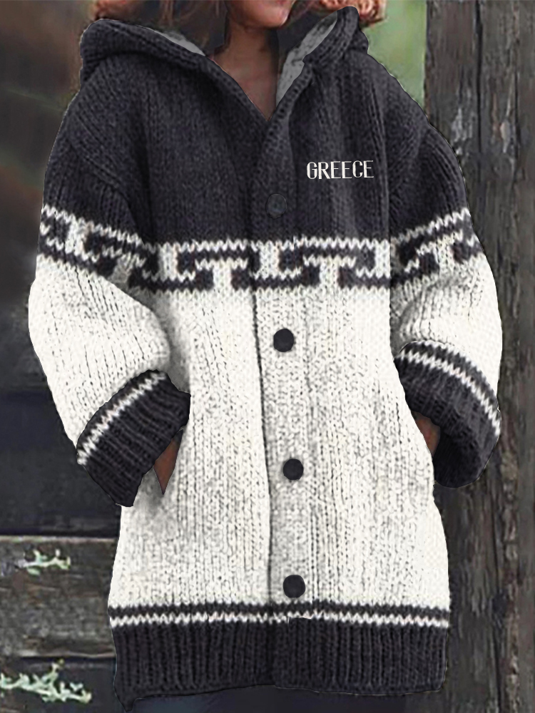 Women's Greek Geometric Jacquard Knit Cozy Hooded Cardigan