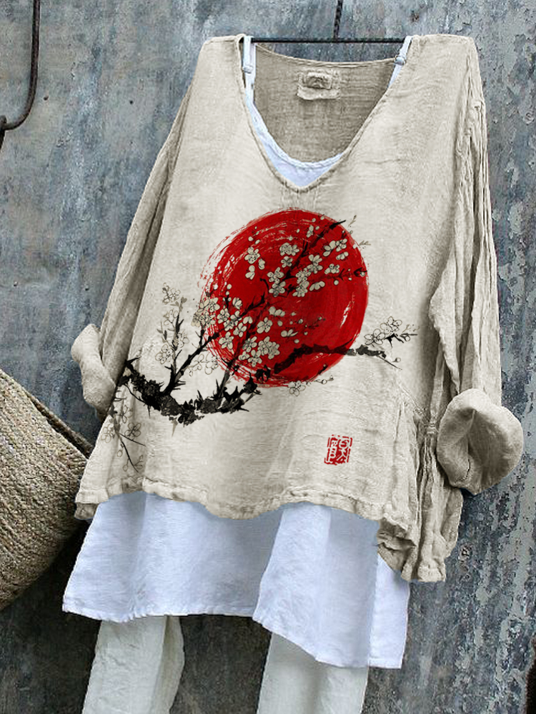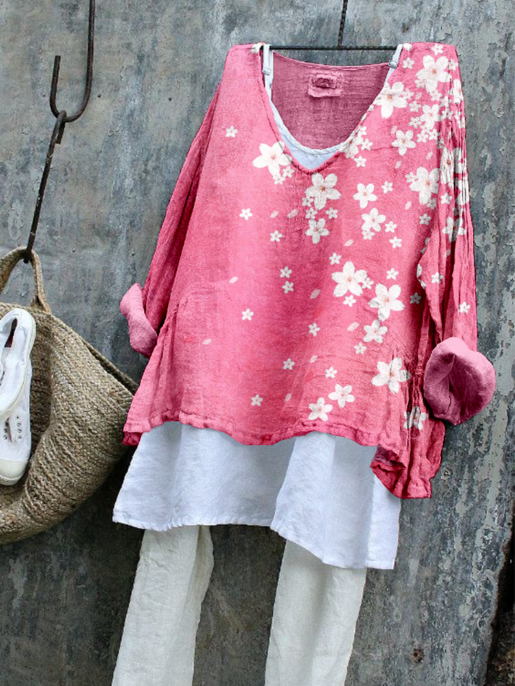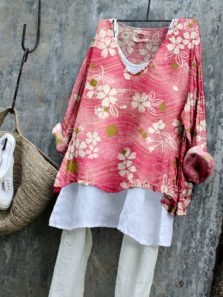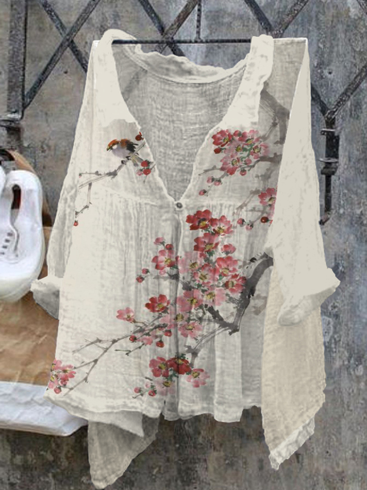 Vintage Floral Art Cotton Linen V Neck Casual Shirt
