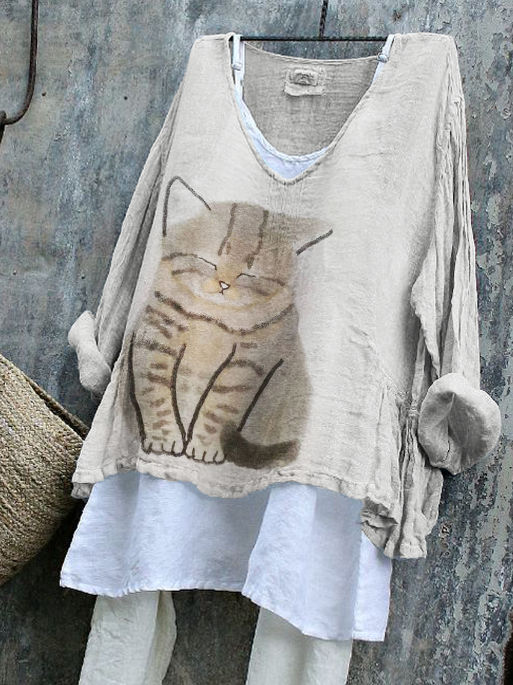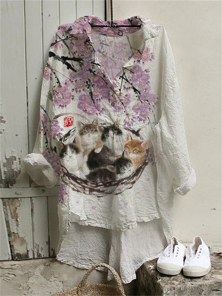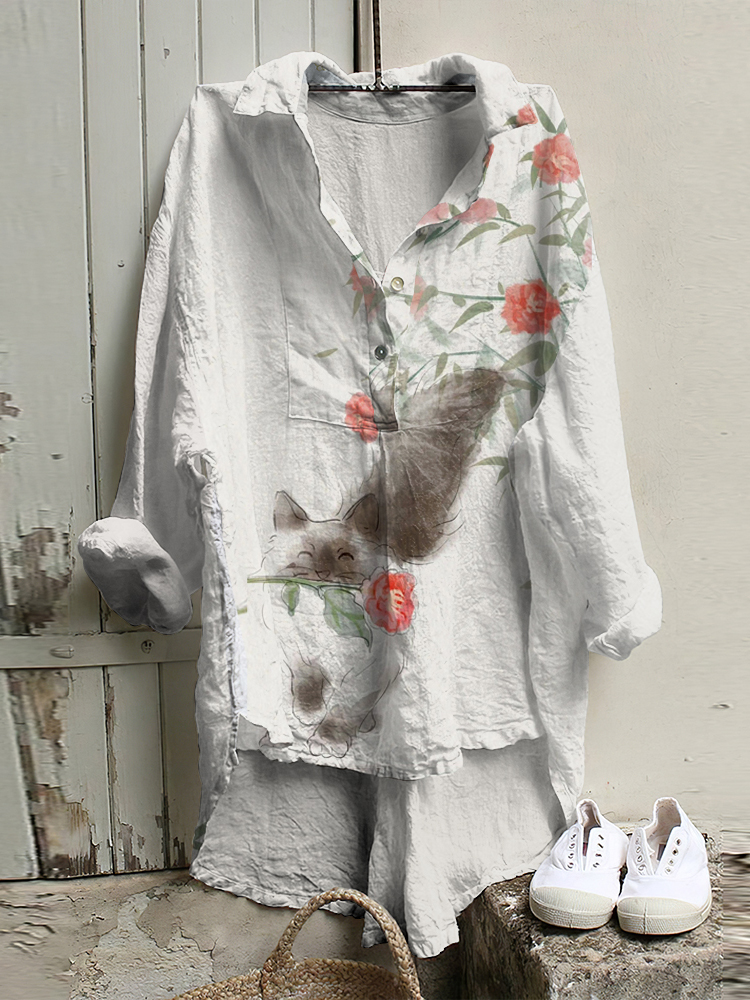 Vintage Cat with Flower Art Cotton Linen Button V Neck Casual Shirt