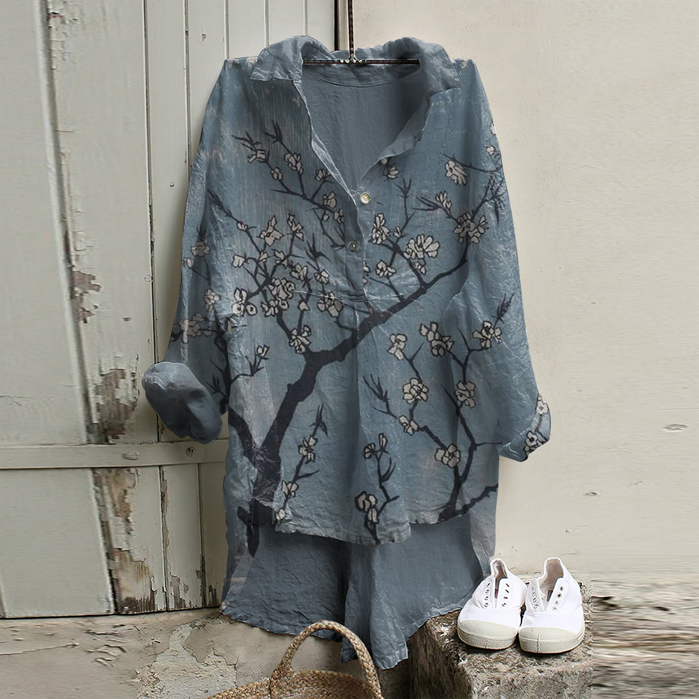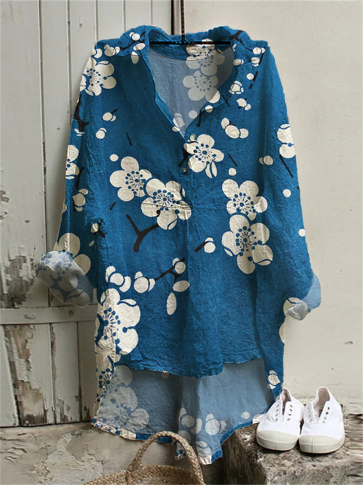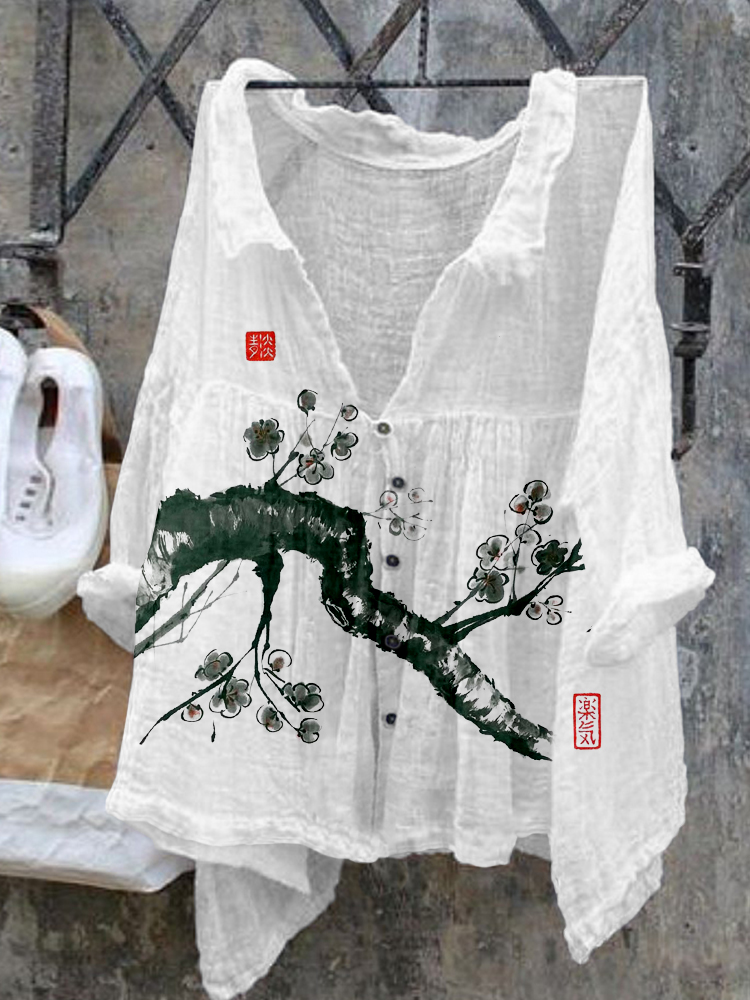 Vintage Floral Art Cotton Linen Button Casual Shirt