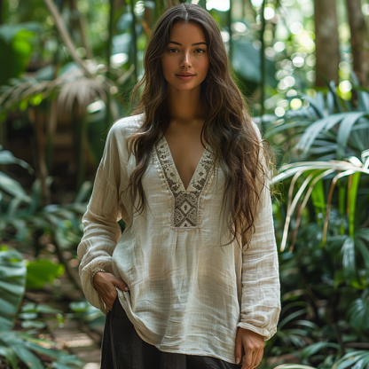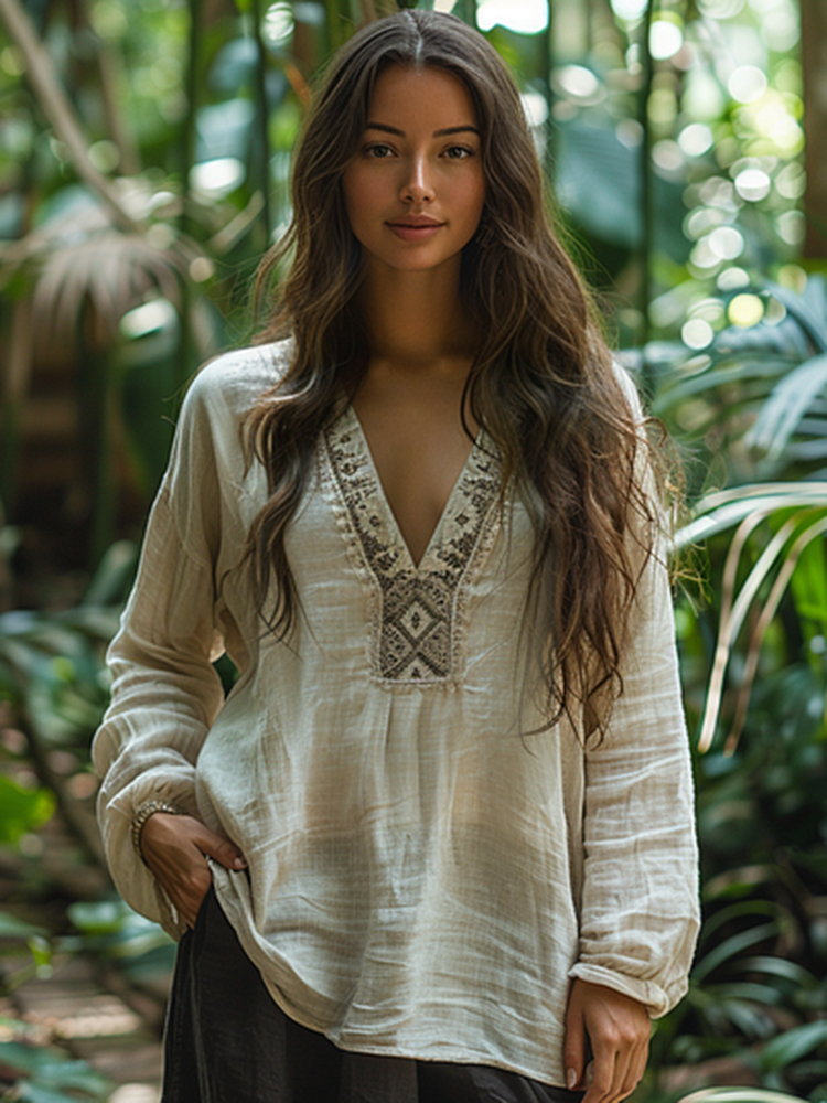 Bohemian Tribal Embroidery Print Cotton And Linen Blend Loose Blouse